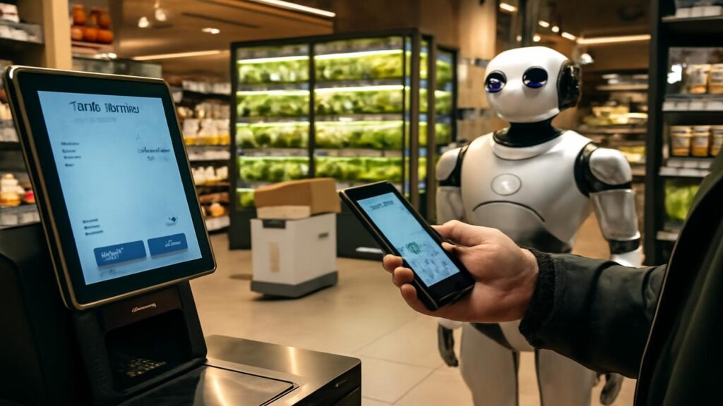 Schon am Eingang erkennt ein System – wenn du zugestimmt hast – per App oder Kundenkarte, dass du da bist. Das heißt nicht, dass du permanent getrackt und analysiert wirst, sondern dass viele Abläufe stressfrei im Hintergrund laufen. Du scannst mit dem Smartphone nur, wenn du willst; manche Bereiche haben smarte Regale, die Produkte selbst registrieren, wenn du sie einpackst. Kein lautes Piepsen, keine wuchtigen Scannerkassen.